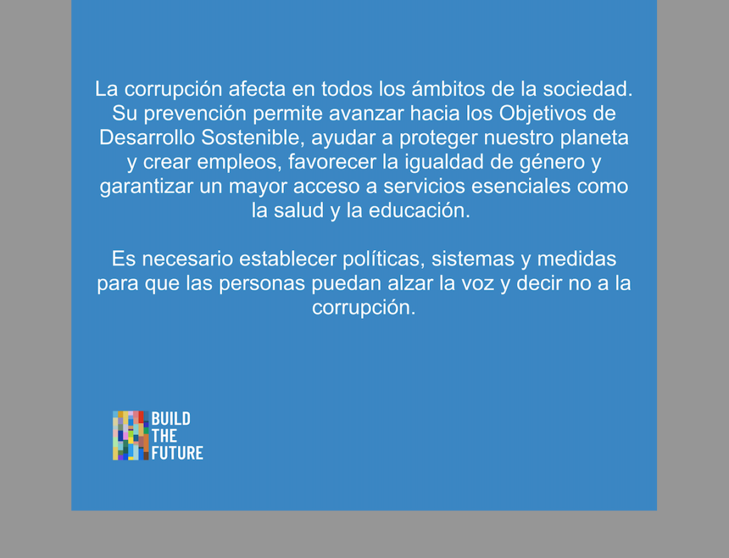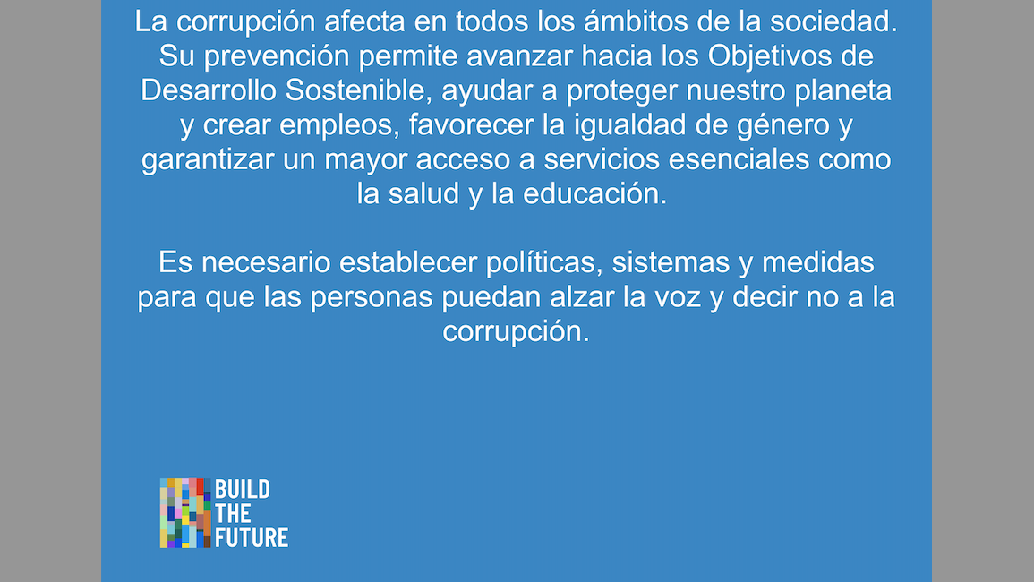 La corrupción afecta en todos los ámbitos de la sociedad. Por eso su prevención permite avanzar hacia los Objetivos de Desarrollo Sostenible, ayudar a proteger nuestro planeta y crear empleos, favorecer la igualdad de género y garantizar un mayor acceso a servicios esenciales como la salud y la educación.